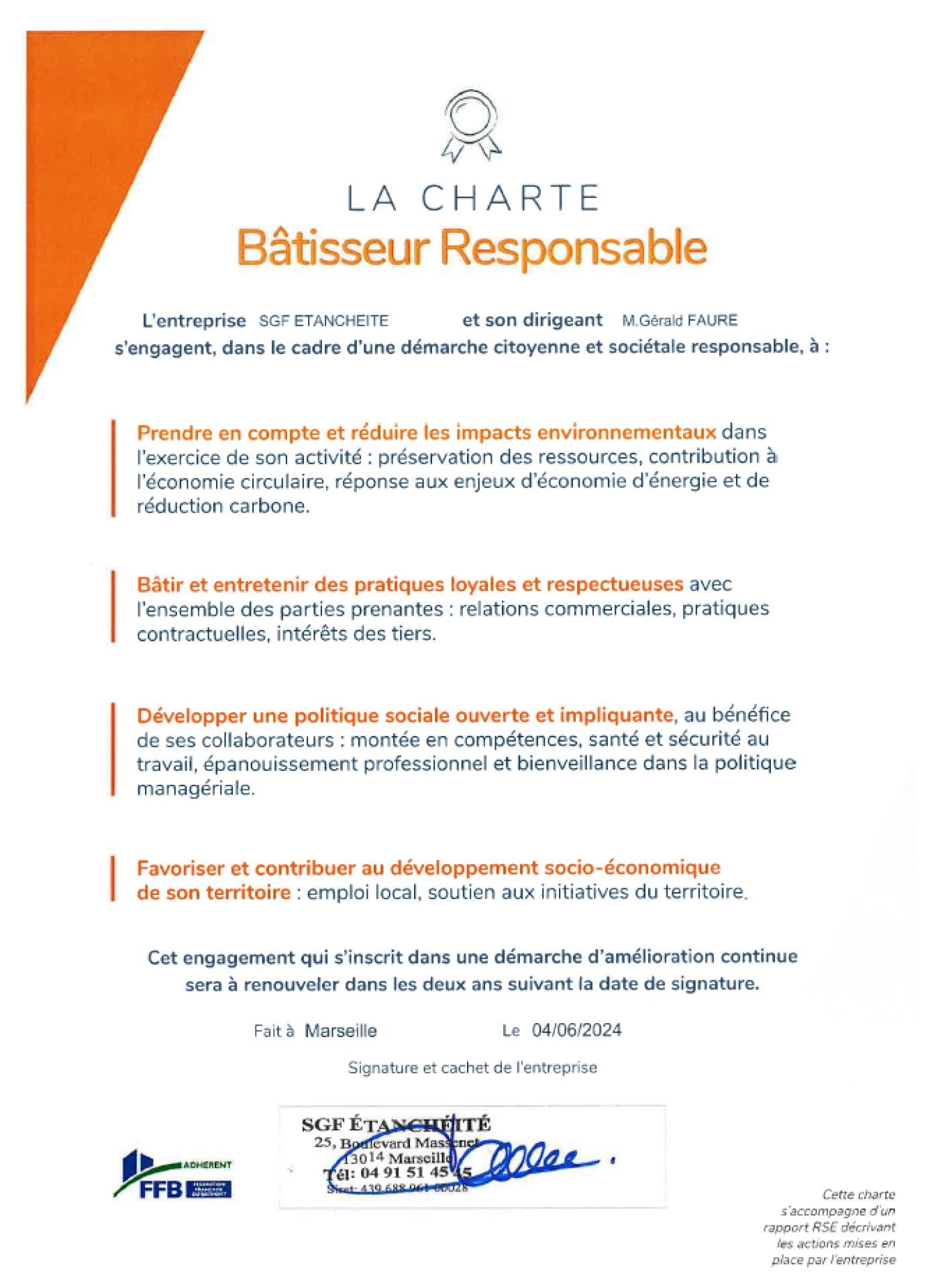 L'entreprise SGF Etanchéité et son dirigeant M.Gérald Faure s'engagent, dans le cadre d'une démarche citoyenne et sociétale responsable, à :
