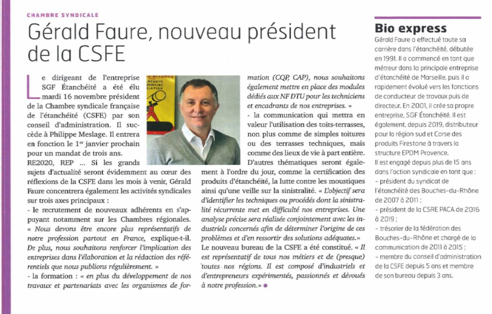 Le dirigeant de l'entreprise SGF ETANCHEITE a été élu mardi 16 novembre 2021 Président de la Chambre Syndicale Française de l'Etanchéité (CSFE) par son conseil d'administration. Il entrera en fonction le 1er janvier 2022 pour un mandat de trois ans.